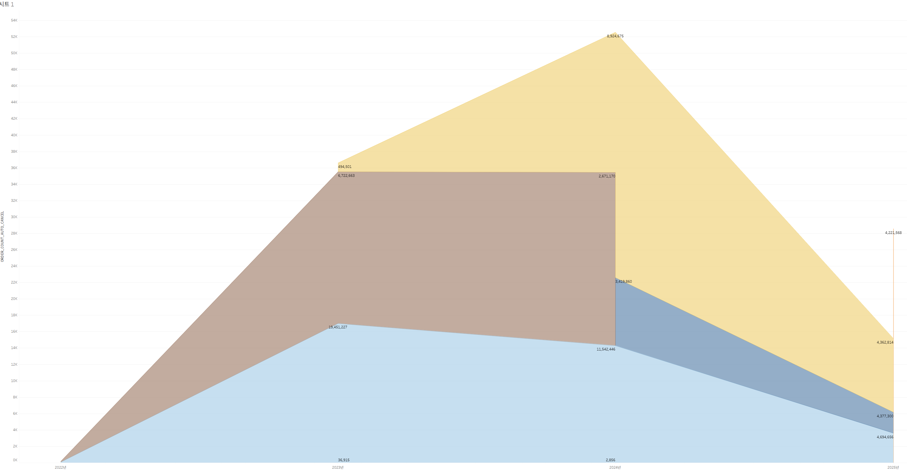시간별 변화와 동시에 누적 효과를 보여주고 싶을 때 사용합니다. 선차트의 확장된 형태로 볼륨감을 표현할 수 있습니다.