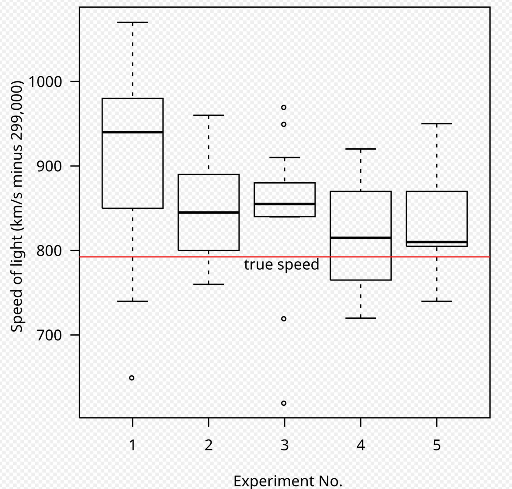 박스의 중앙선은 중앙값, 박스 크기는 데이터의 분산 정도, 박스 외부의 점들은 이상치를 나타냅니다.