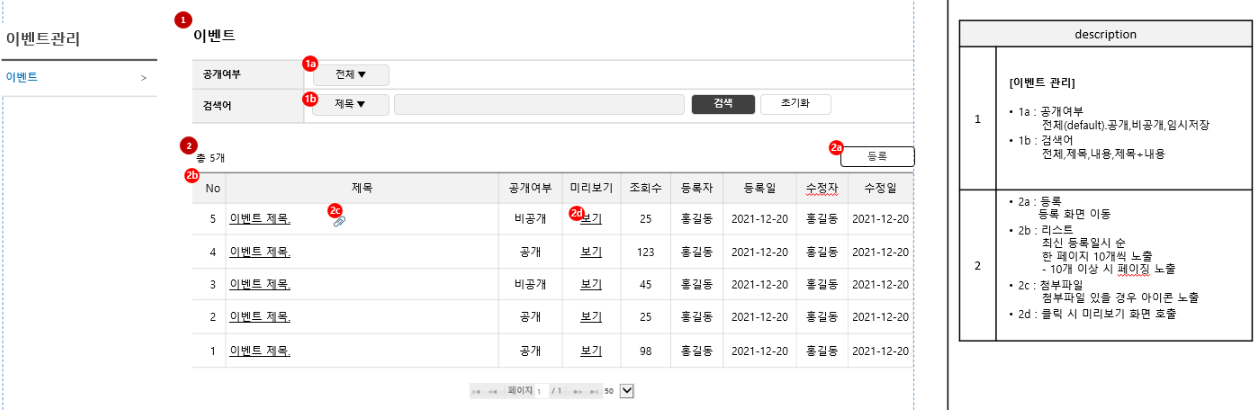- 검색 및 필터(Search and Filter): 제목, 등록일, 공개 여부 등을 기준으로 검색 및 필터링할 수 있는 기능. 이벤트의 상태(예: 진행 중, 종료, 예정)나 특정 기간 동안 등록된 이벤트를 필터링 가능.