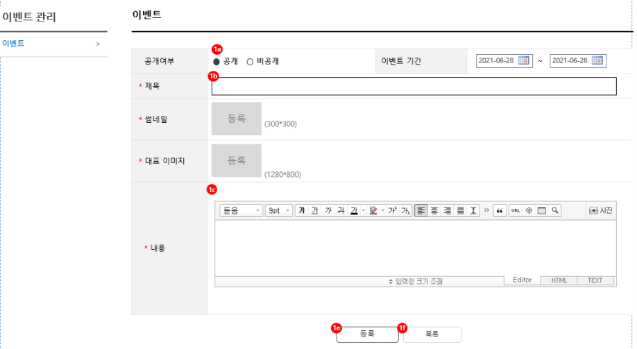 - 이벤트에 대한 상세 설명을 입력할 수 있는 텍스트 에디터. 텍스트, 이미지, 링크 등을 포함할 수 있도록 지원.