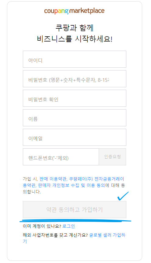 - "약관 동의 후 진행" 버튼 클릭으로 필수 약관 일괄 동의.